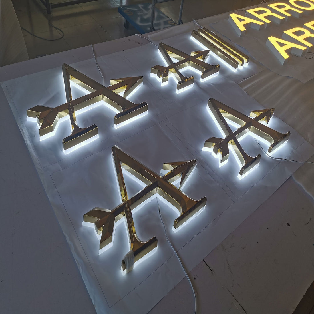 Wholesale factory supplies halo lit acrylic LED letters mirror finish golden stainless steel beveled face letter logo