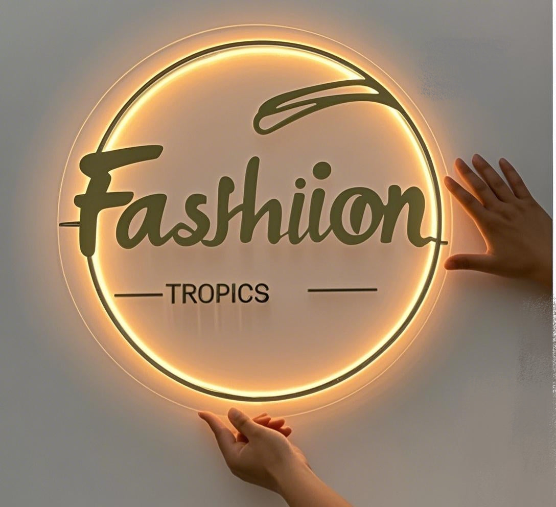 Round backlit acrylic sign, the "Fashion" text can be UV - customized, suitable for shopping malls, clothing stores and various other places