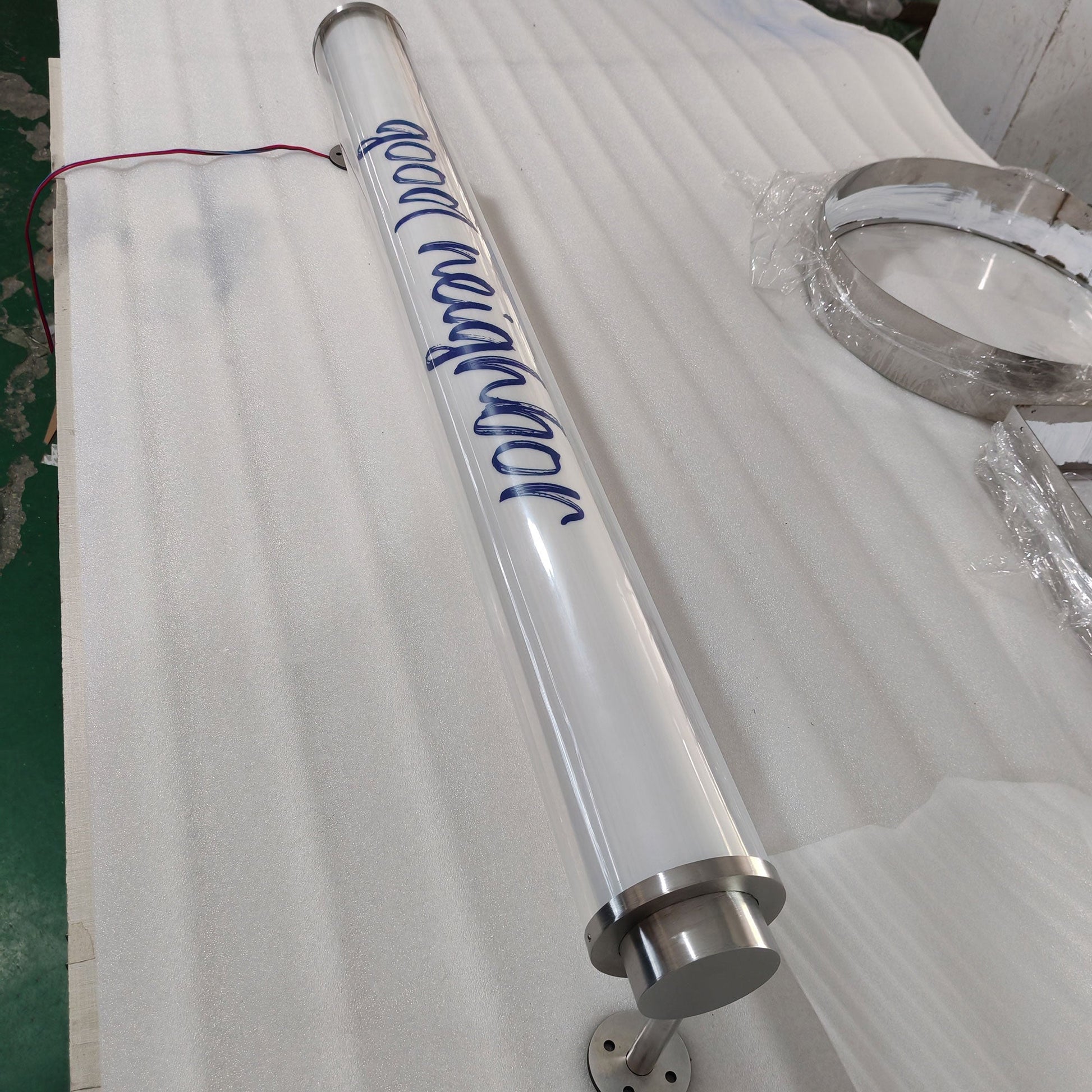 The round tube lightbox sign mainly consists of three parts: a cylindrical acrylic round tube, stainless steel or aluminum brackets on both sides, and LED lights installed inside the acrylic. Sometimes there is also a glass shell on the outside of acrylic, which is designed to better protect the sign.