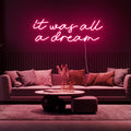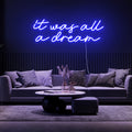 Introducing the "It was all a dream 2" Neon light. Featuring a bold, eye-catching design, this neon light is perfect for adding a touch of personality to any room. Made with high-quality materials, it emits a vibrant glow that will enhance the atmosphere of any space. Brighten up your home or office with this unique and stylish neon light.