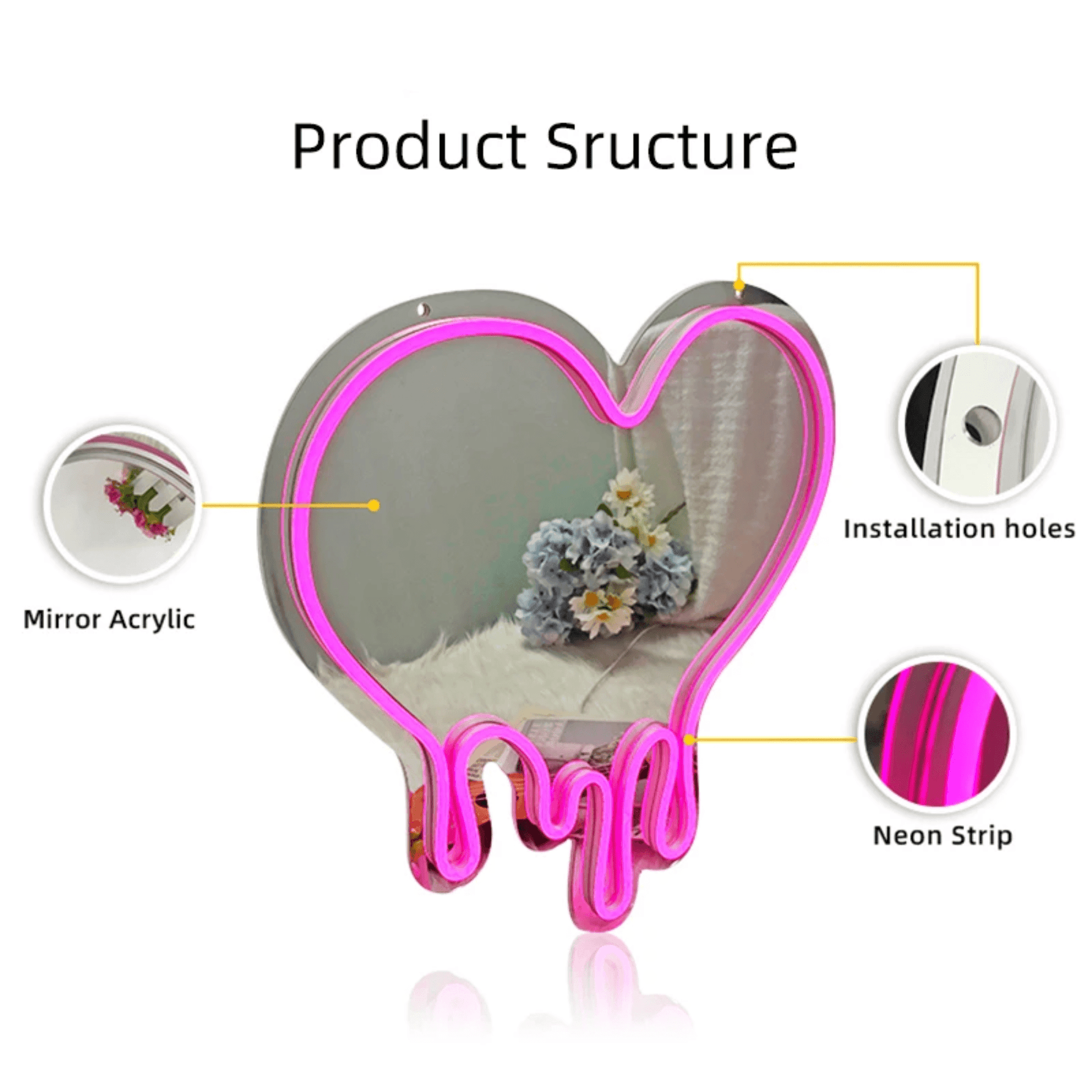 Illuminate your home with the charming glow of our LED Heart Neon Mirror. This unique piece combines the warmth of neon lighting with the reflective beauty of a mirror, creating an enchanting ambiance that's perfect for any room looking for a hint of romance or whimsy. Perfect for a gift for Birthdays, Valentines day or for a Room Decor.