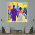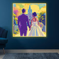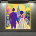 Square Photo Frame Neon signs| Bride And Groom Holding Hands Facing Church | Golden Grass And Clouds Background | LED Wedding Decoration